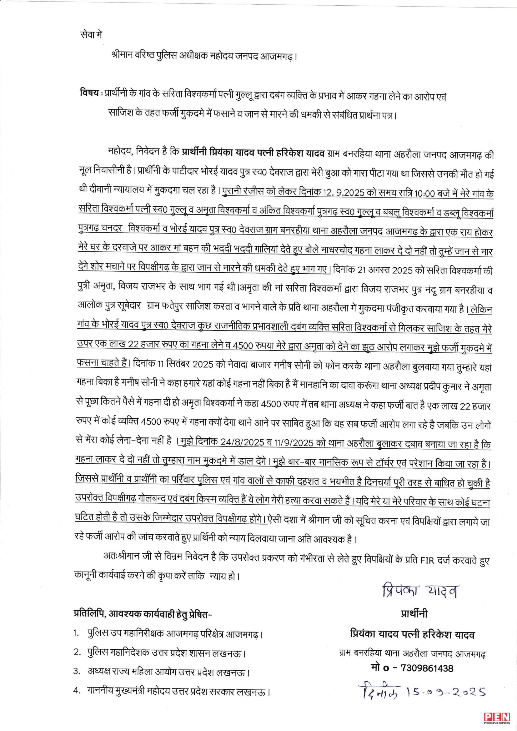आजमगढ़, उत्तर प्रदेश: अहरौला थाना क्षेत्र के बनरहिया गांव में एक महिला ने पुलिस अधीक्षक से न्याय की गुहार लगाई है। प्रियंका यादव (पत्नी हरिकेश यादव) ने अपने गाँव के कुछ लोगों पर गहने चोरी और जबरन वसूली के झूठे आरोप लगाकर परेशान करने का आरोप लगाया है।