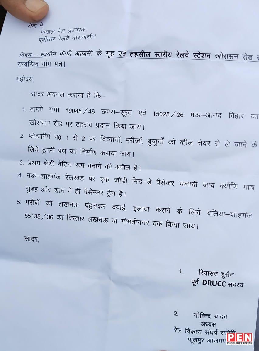 आजमगढ़, उत्तर प्रदेश: पूर्वोत्तर रेलवे वाराणसी मंडल के डीआरएम को खोरासन रोड रेलवे स्टेशन से संबंधित विभिन्न मांगों को लेकर एक ज्ञापन सौंपा गया है। यह ज्ञापन पूर्व डीआरयूसीसी सदस्य रियासत हुसैन व रेल विकास संघर्ष समिति फूलपुर-आजमगढ़ के अध्यक्ष गोविंद यादव ने दिया । ज्ञापन में मुख्य रूप से पांच प्रमुख मांगें उठाई गई हैं, जिनका उद्देश्य खोरासन रोड रेलवे स्टेशन पर सुविधाओं को बेहतर बनाना और यात्रियों की परेशानी को कम करना है।